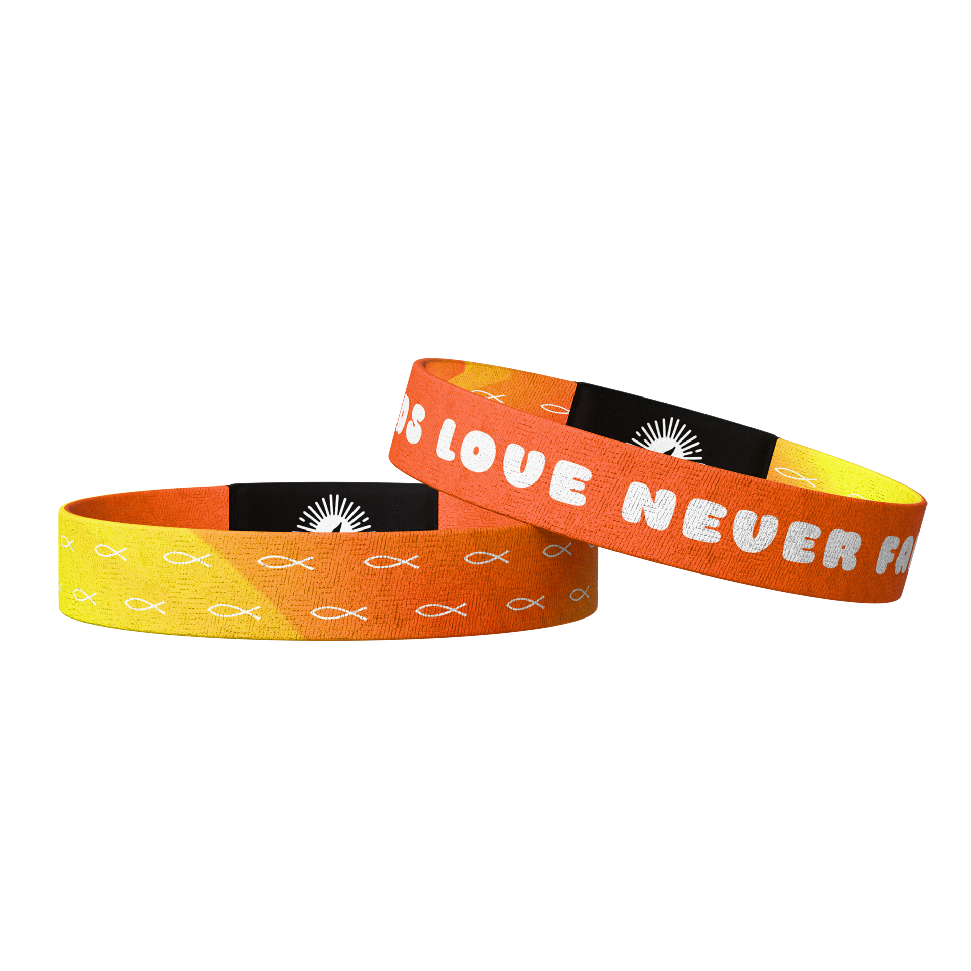 One side says “God’s Love Never Fails” in bold white letters on a vibrant orange and yellow gradient. The other side is patterned with the Christian fish symbol, pointing back to the earliest expression of faith and God’s unending promise. With a quick tap, a verse shows up on your phone, encouragement for the exact moment you need it.