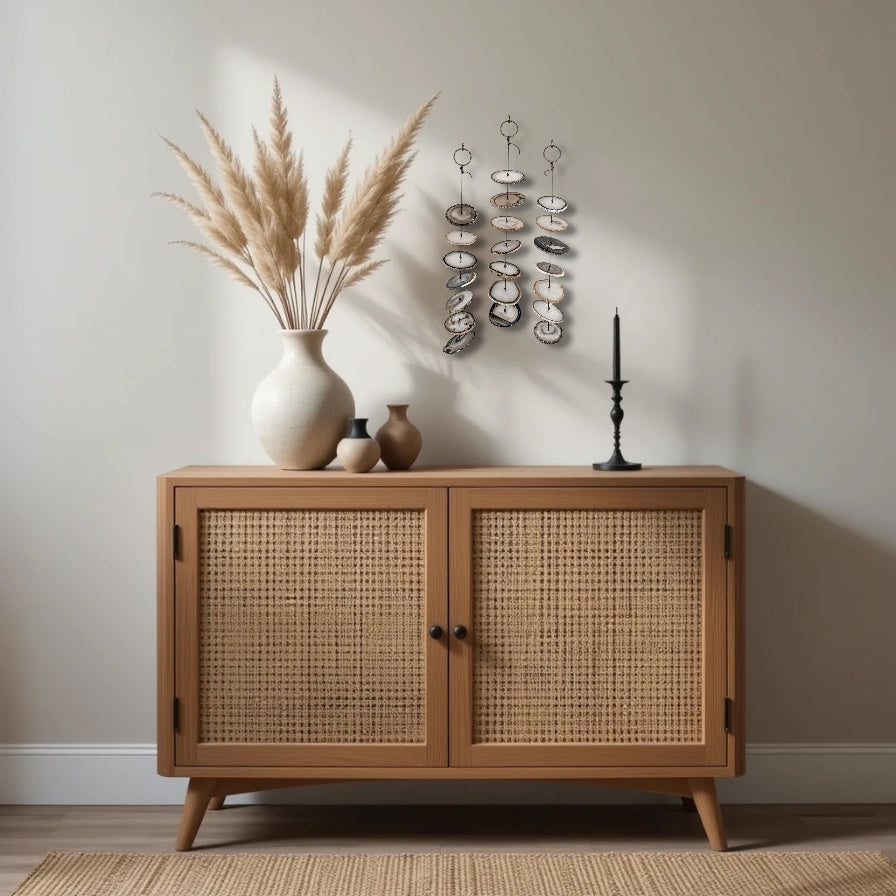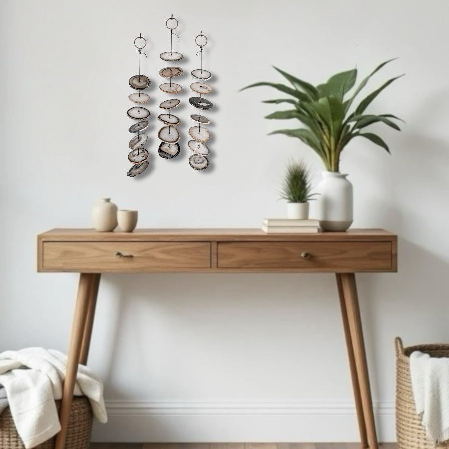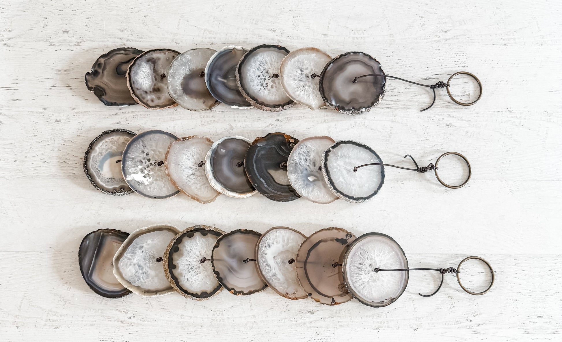 Introducing something new for the agate lover who craves sculptural simplicity. The Charcoal Indoor Agate Slice Sculpture was thoughtfully designed to showcase agate slices in a fresh way—horizontally suspended rather than our traditional vertical garlands. Gray/black/white slices are stacked in a soft flow, threaded with distressed gray leather cording and finished with a dark bronze metal ring hanger. The result is a modern, light-catching piece that feels both earthy and elevated.
