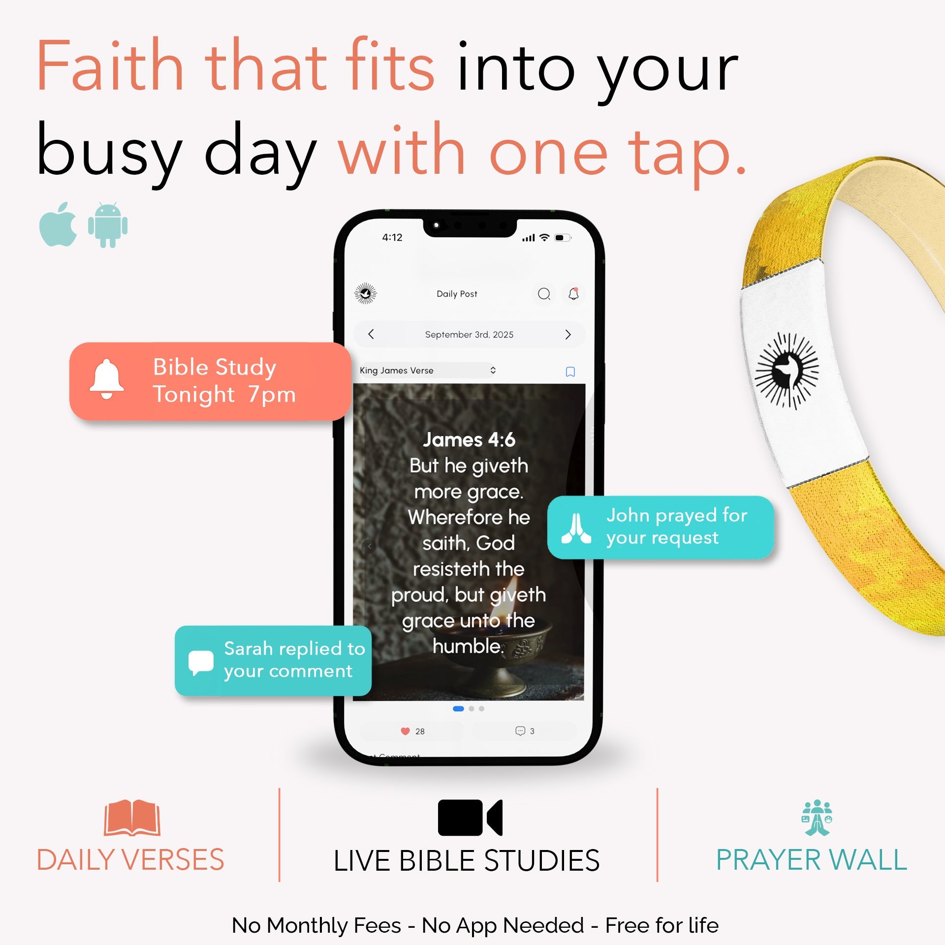 The design pairs soft golden tones with bold lettering that declares “He Has Risen” on one side. The other side shows a cross against a sunrise sky, a picture of the hope and victory we have because of the resurrection. With just a tap, a new verse appears on your phone, encouragement for any moment you need it.