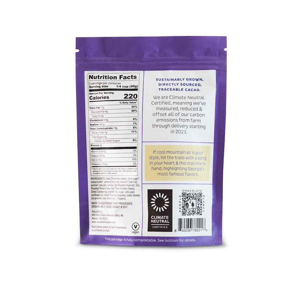 Dry-roasted organic pecans, dry-roasted organic peanuts, dark chocolate* (cacao, organic cane sugar), raw pumpkin seeds, dried peaches, dried cranberries