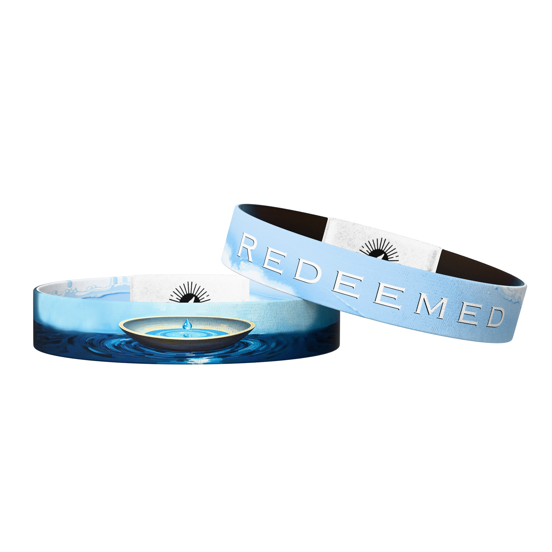 The design pairs a soft blue backdrop with the bold word “Redeemed” on one side. The other side shows rippling water with a single drop, a picture of how God’s mercy restores us and makes us new. With a quick tap, a verse appears on your phone, giving you encouragement right when you need it.