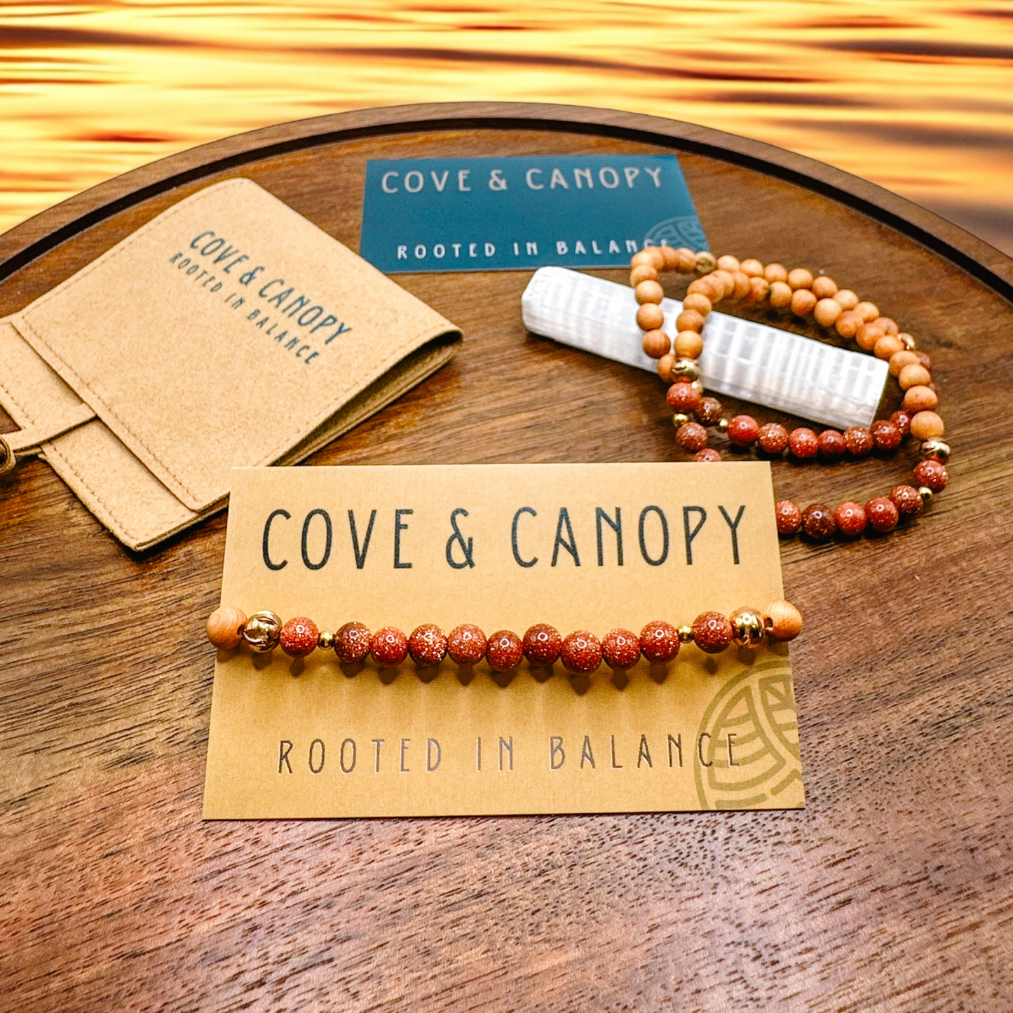 - Materials: Sandalwood, Sunstone beads, and rose gold accents