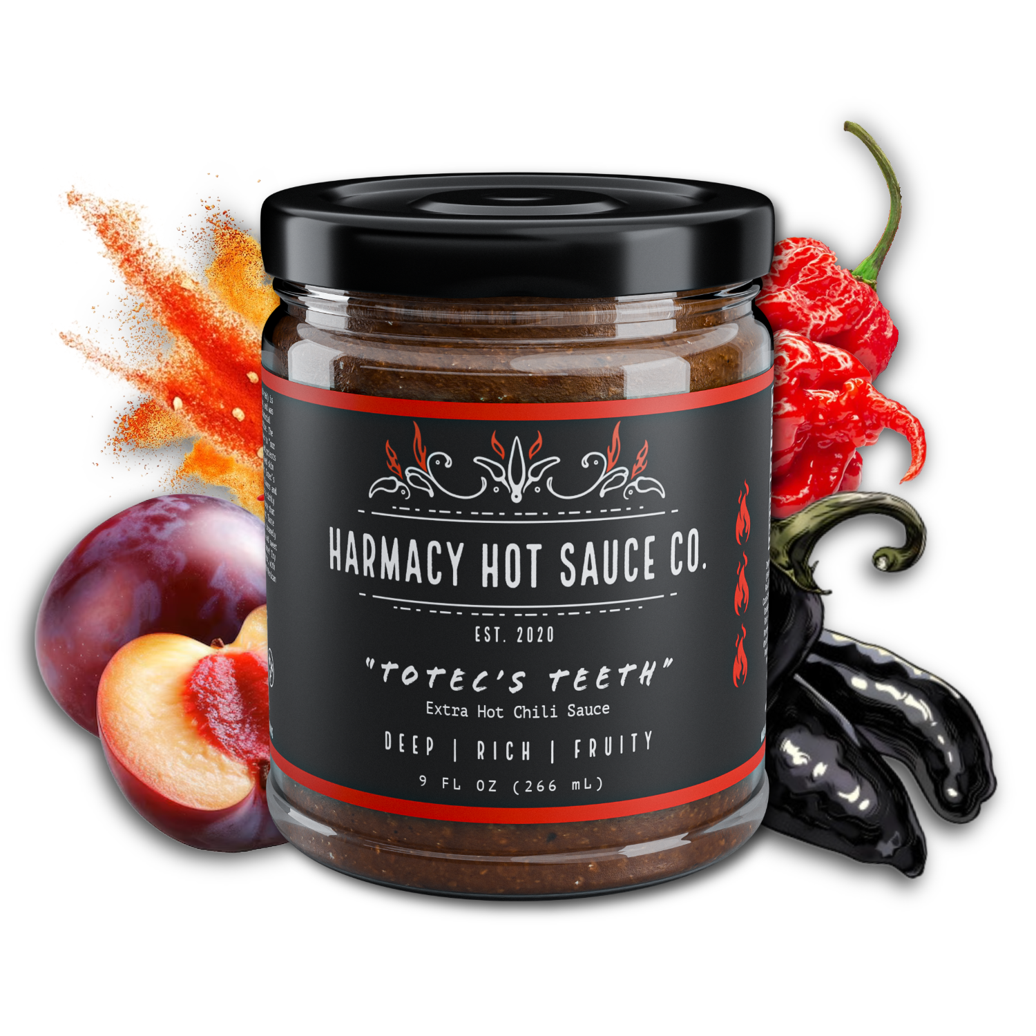 Xipe Totec (shee-pey toh-tek) is the Aztec god of spring, and was honored through gladiatorial combat and human sacrifice. The name literally translates to “our lord, the flayed one”, and priests would wear victim’s flayed skin during ceremonial rites. Totec’s Teeth brings old world flavors and ingredients forward in a richly colored and flavored sauce that will cut your heart out. Taste flavorful dried chilis, insanely spicy super hot chilis, and sweet plums in this unique sauce! Try this on most any protein, with BBQ, in chili, and with Mexican cuisine! 9/10 heat.