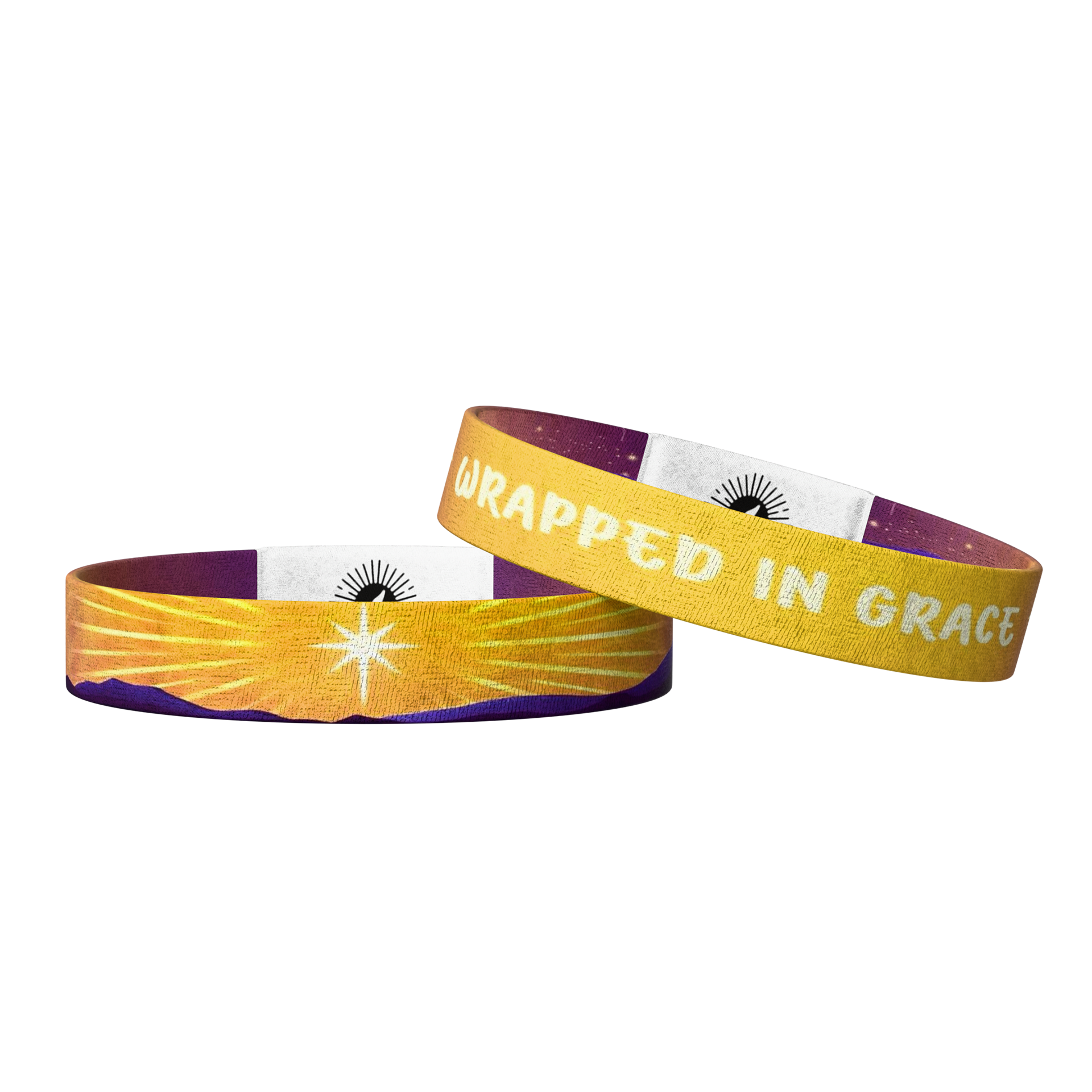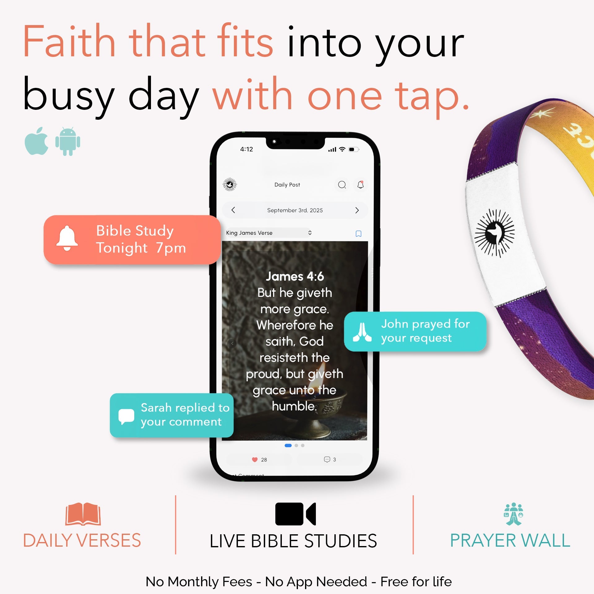 The design pairs deep purples and golden tones with radiant beams of light and a shining star. One side carries the words “Wrapped in Grace,” the other side displays the glowing artwork, a picture of God’s presence and mercy surrounding you. With just a tap, a new verse appears on your phone, encouragement right when you need it most.